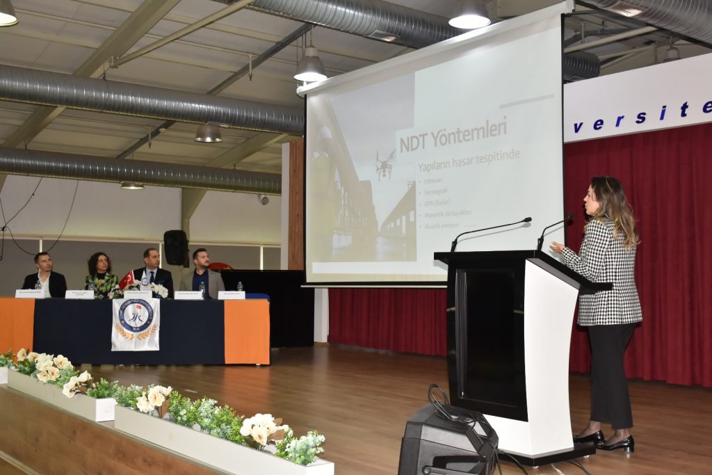 İzmir Demokrasi Üniversitesi İnşaat Mühendisliği Bölümü Öğretim Üyesi Doç. Dr. Elif Çağda Kandemir, “Depreme Dayanıklı Yapılar için Sismik İzolatörler ve Enerji Sönümleyiciler” başlıklı sunumunda, yapıların deprem yüklerine karşı korunmasını sağlayan teknolojilere dair bilgi verdi.