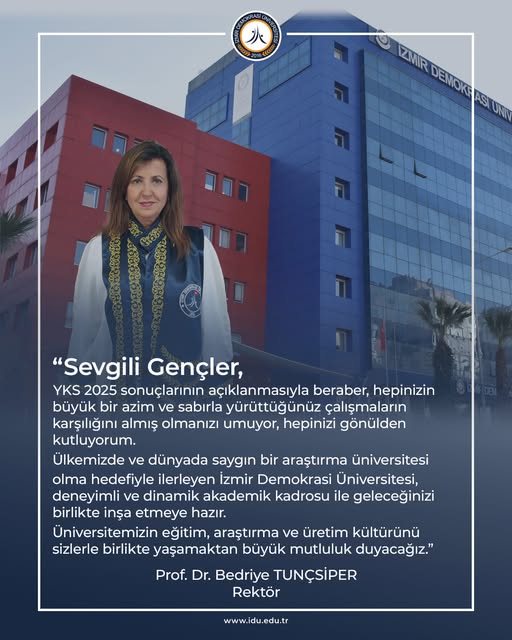 İzmir Demokrasi ÜniversitesiHedefimiz; öncelikle insani değerlerine sahip, ülkemize faydalı, yenilikçi, teknolojiyi yakından takip eden ve geliştiren vizyon sahibi öğrenciler yetiştirmektir. İzmir Demokrasi Üniversitesi; bilim, sağlık, sanat, ekonomi, kültür ve teknolojiye katkı sağlamayı; etik değerleri gözeterek yenilikçi ve disiplinler arası araştırmalar yapmayı; nitelikli, eleştirel düşünebilen, geleceğe yön veren bireyler yetiştirerek topluma hizmet etmeyi görev edinmiştir.