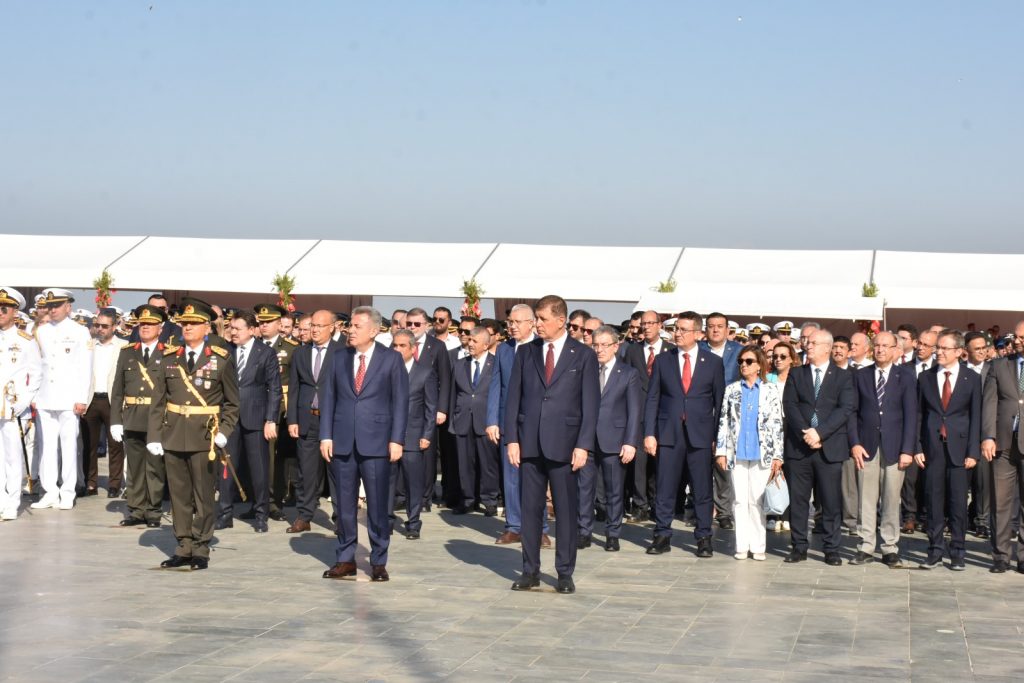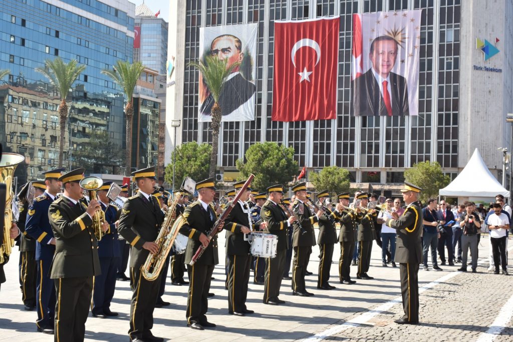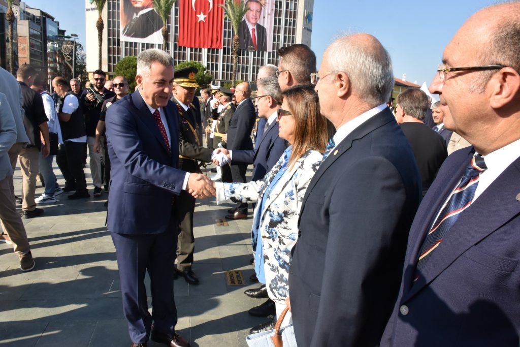 Kutlamalar, Atatürk Anıtı’na çelenk sunumuyla başladı. Törene İzmir Valisi Süleyman Elban, İzmir Büyükşehir Belediye Başkanı Cemil Tugay, Ege Ordusu ve Garnizon Komutanı Orgeneral İrfan Özsert, milletvekilleri, siyasi parti temsilcileri, üniversite rektörleri, idari ve askeri erkan ile vatandaşlar katıldı.