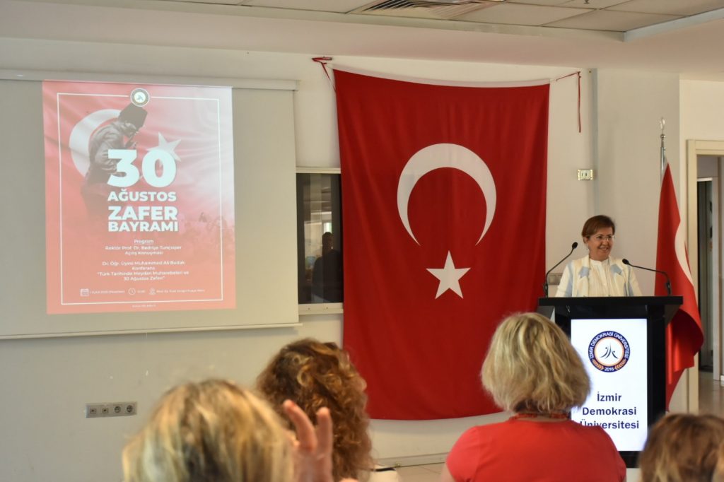İzmir Demokrasi Üniversitesi, 30 Ağustos Zafer Bayramı’nın 103. yıl dönümünü düzenlediği özel bir etkinlikle kutladı. Prof. Dr. Fuat Sezgin Fuaye Alanı’nda gerçekleşen program, İzmir Demokrasi Üniversitesi Rektörü Prof. Dr. Bedriye Tunçsiper’in açılış konuşmasıyla başladı.