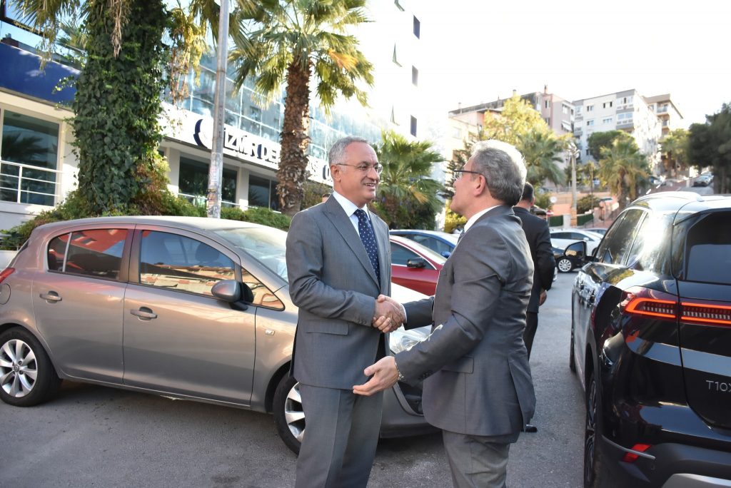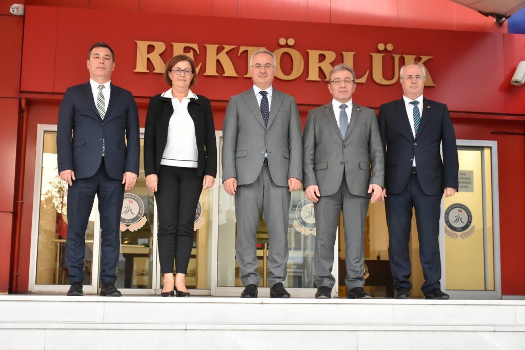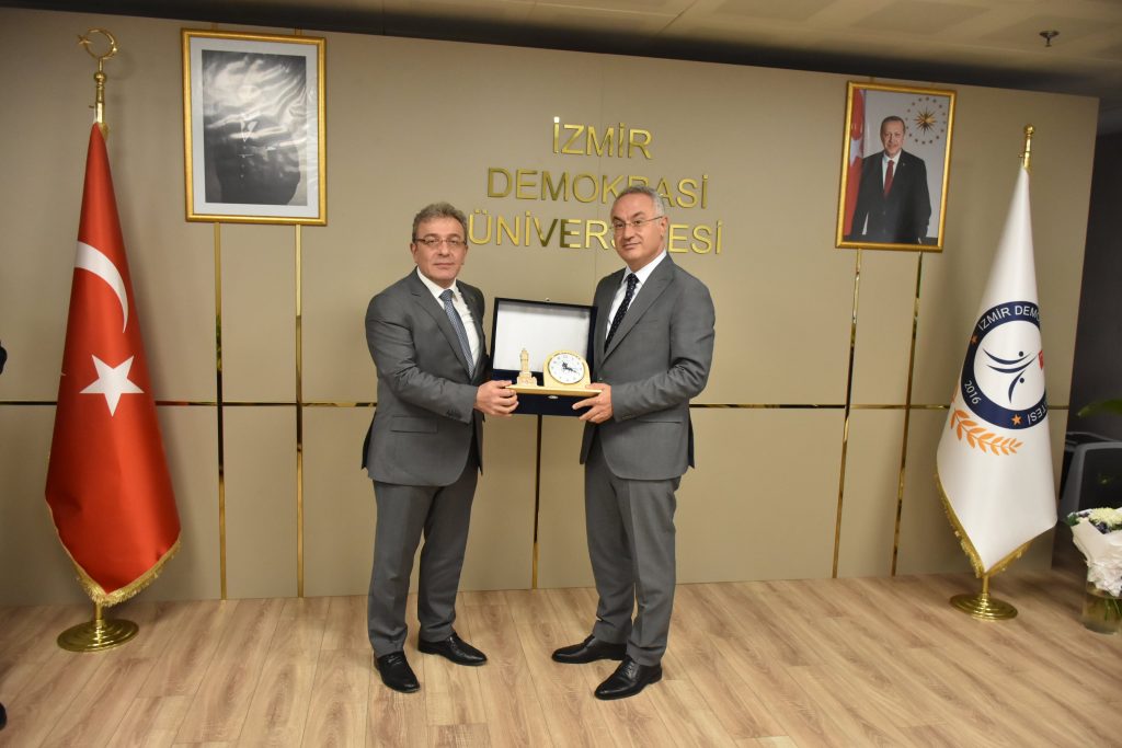 Dokuz Eylül Üniversitesi Rektörü Prof. Dr. Bayram Yılmaz, beraberinde Rektör Yardımcıları Prof. Dr. Hamdi Şükür Kılıç, Prof. Dr. Dilşen İnce Erdoğan ve Genel Sekreter Prof. Dr. Dündar Yener ile İzmir Demokrasi Üniversitesi Rektörü Prof. Dr. Selim Karahasanoğlu’nu makamında ziyaret etti.