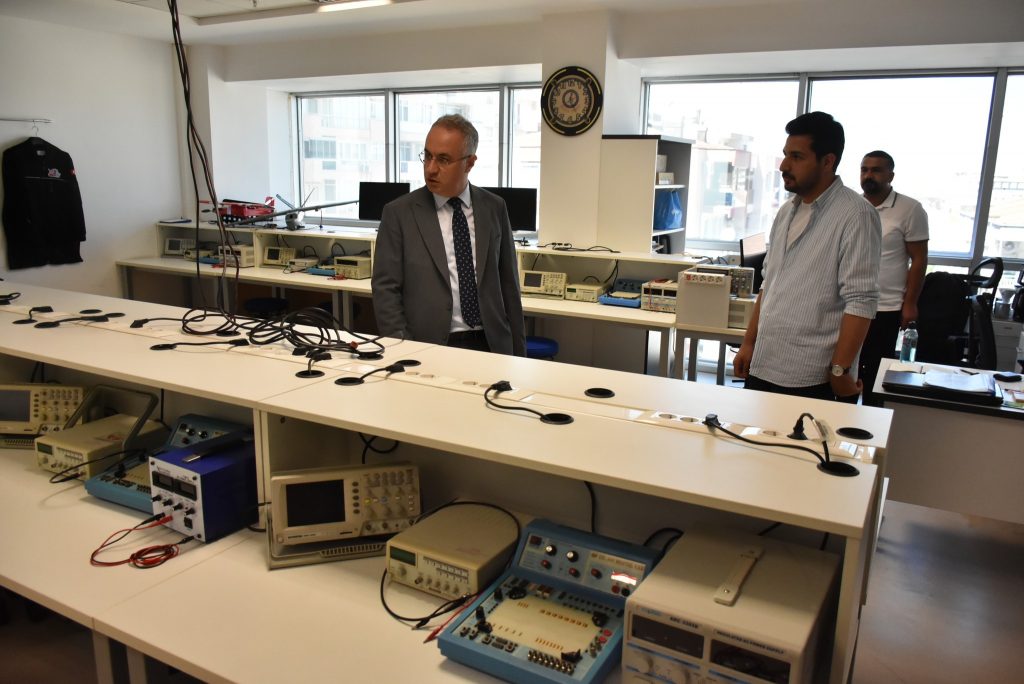 Rektör Karahasanoğlu, Elektrik-Elektronik Mühendisliği Bölümü laboratuvarlarını da ziyaret ederek, burada yürütülen çalışmalar ve laboratuvar altyapısına ilişkin bilgi aldı.