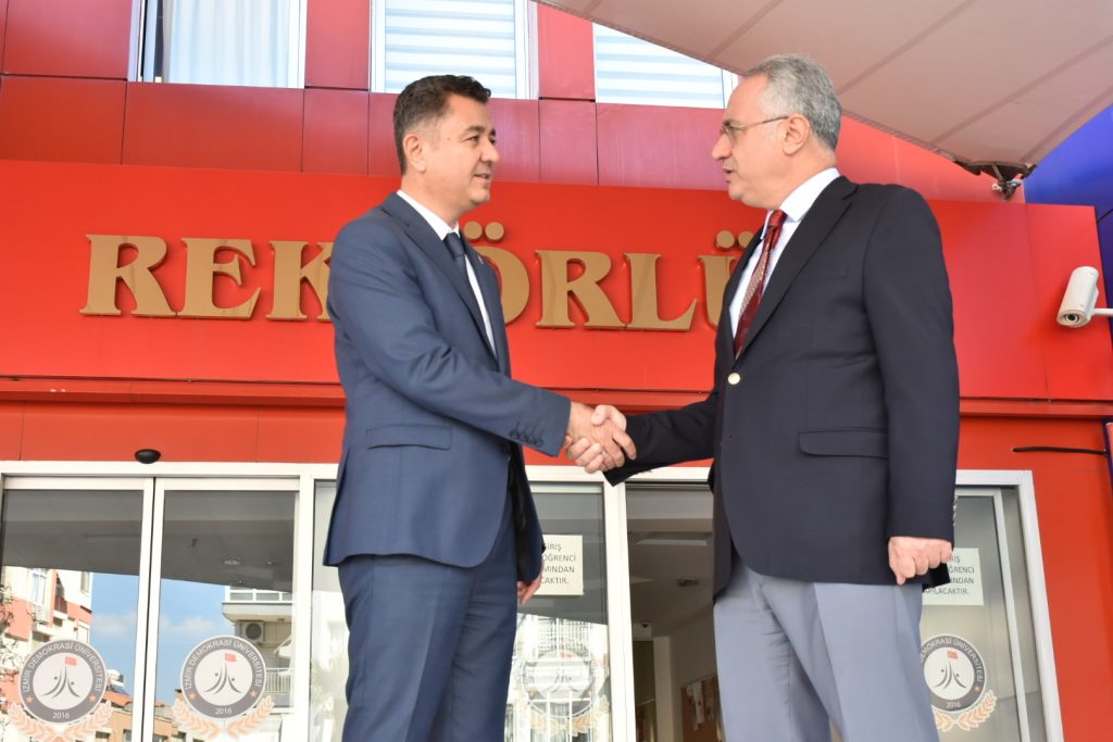 Konak Kaymakamı Ediz Sürücü, Rektör Karahasanoğlu’nu ziyaret ederek yeni görevi vesilesiyle başarı diledi.