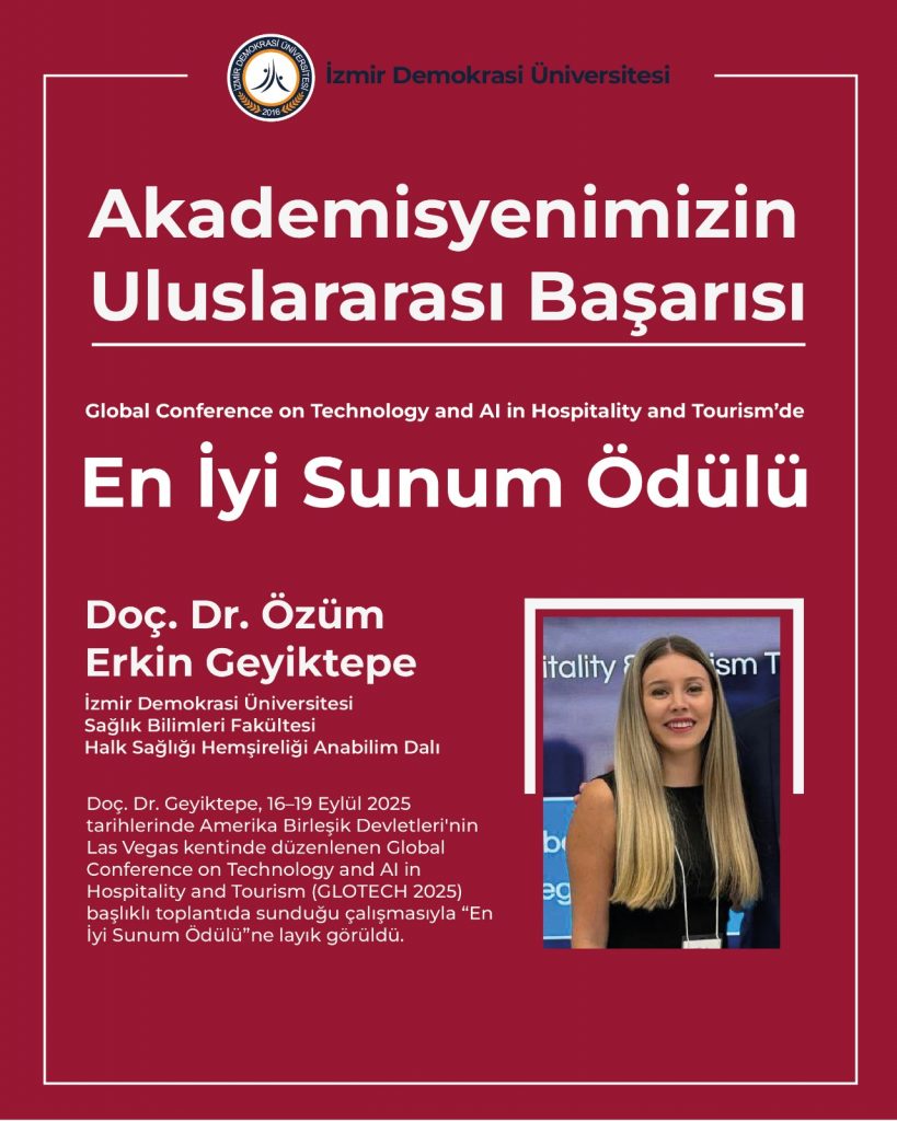 Doç. Dr. Geyiktepe, 16–19 Eylül 2025 tarihlerinde Amerika Birleşik Devletleri’nin Las Vegas kentinde düzenlenen Global Conference on Technology and AI in Hospitality and Tourism (GLOTECH 2025) başlıklı toplantıda sunduğu çalışmasıyla “Best Presentation Award” (En İyi Sunum Ödülü)’ne layık görüldü.