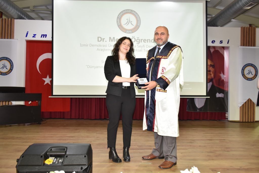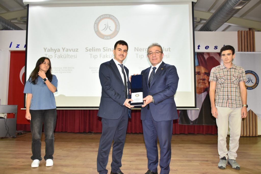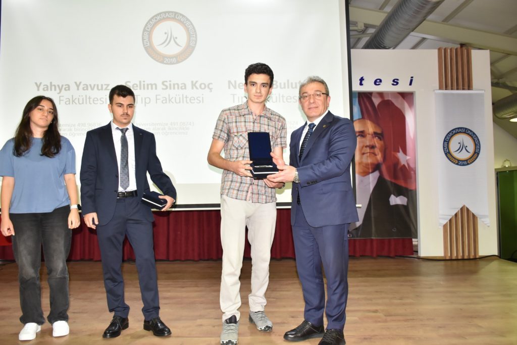 Prof. Dr. Fazlıoğlu’nun konferansının ardından, üniversiteye en yüksek puanla yerleşen ilk üç öğrenciye plaketleri Dokuz Eylül Üniversitesi Rektörü Prof. Dr. Bayram Yılmaz tarafından verildi.