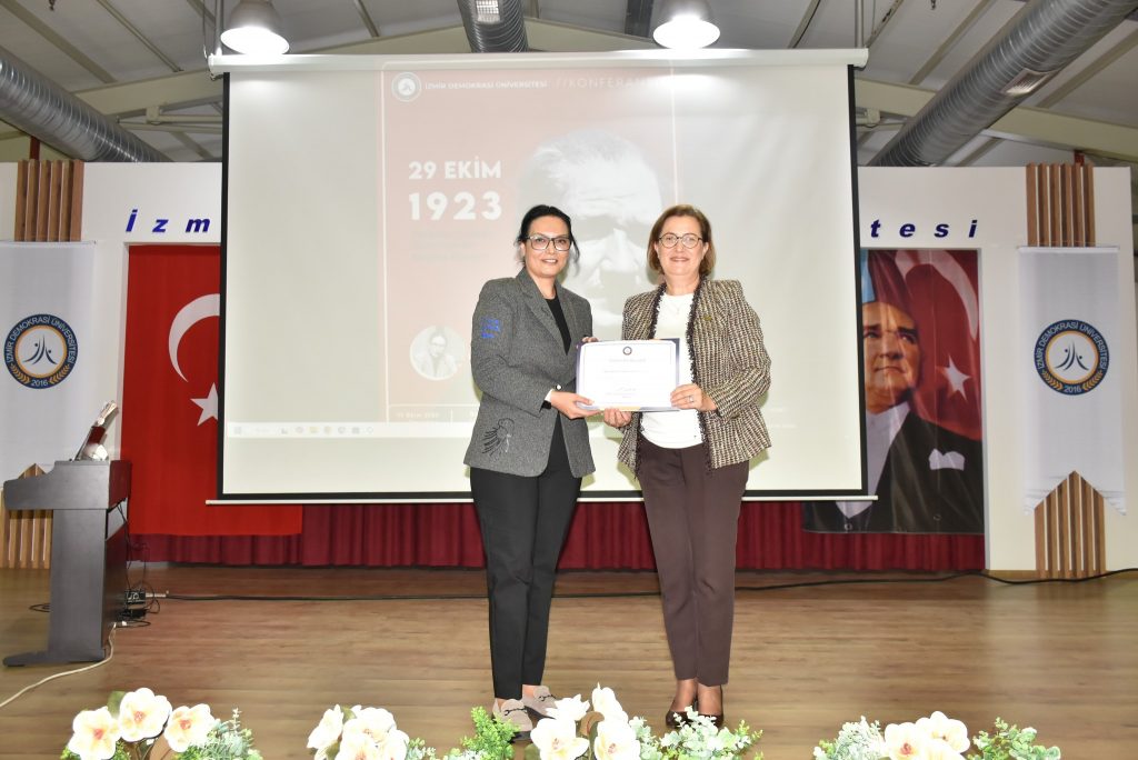 Cumhuriyet’in kuruluş sürecinin uluslararası dengeler içindeki yerinin ele alındığı konferansın sonunda, Rektör Karahasanoğlu konuk konuşmacı Doç. Dr. Hacer Karabağ Arslan’a plaket takdim ederken, Prof. Dr. Dilşen İnce Erdoğan ise teşekkür belgesi sundu.