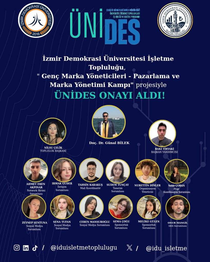 İzmir Demokrasi Üniversitesi İşletme Topluluğu, “Genç Marka Yöneticileri – Pazarlama ve Marka Yönetimi Kampı” başlıklı projeleriyle ÜNİDES (Üniversite Öğrenci Toplulukları İş Birliği ve Destek Programı) kapsamında desteklenmeye hak kazandı.