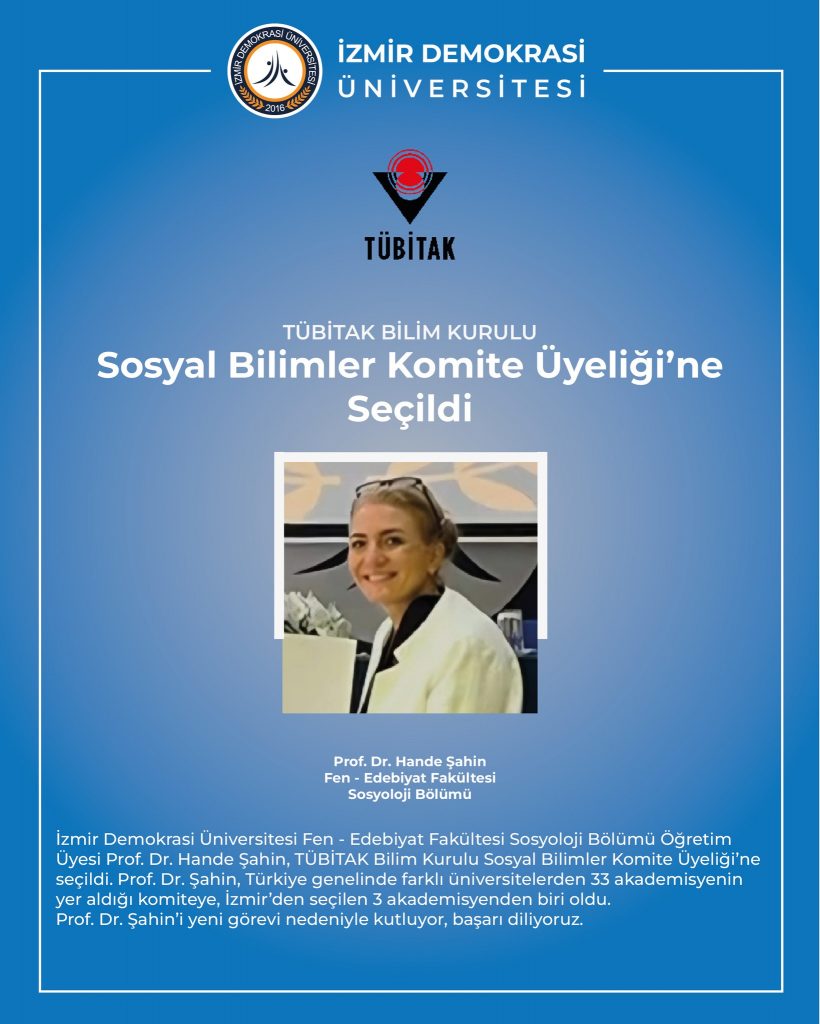 İzmir Demokrasi Üniversitesi Fen – Edebiyat Fakültesi Sosyoloji Bölümü Öğretim Üyesi Prof. Dr. Hande Şahin, TÜBİTAK Bilim Kurulu Sosyal Bilimler Komite Üyeliği’ne seçildi. Prof. Dr. Şahin, Türkiye genelinde farklı üniversitelerden 33 akademisyenin yer aldığı komiteye, İzmir’den seçilen 3 akademisyenden biri oldu.Prof. Dr. Şahin’i yeni görevi nedeniyle kutluyor, başarı diliyoruz.