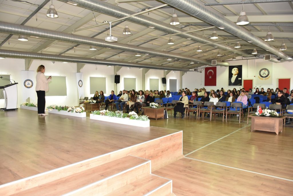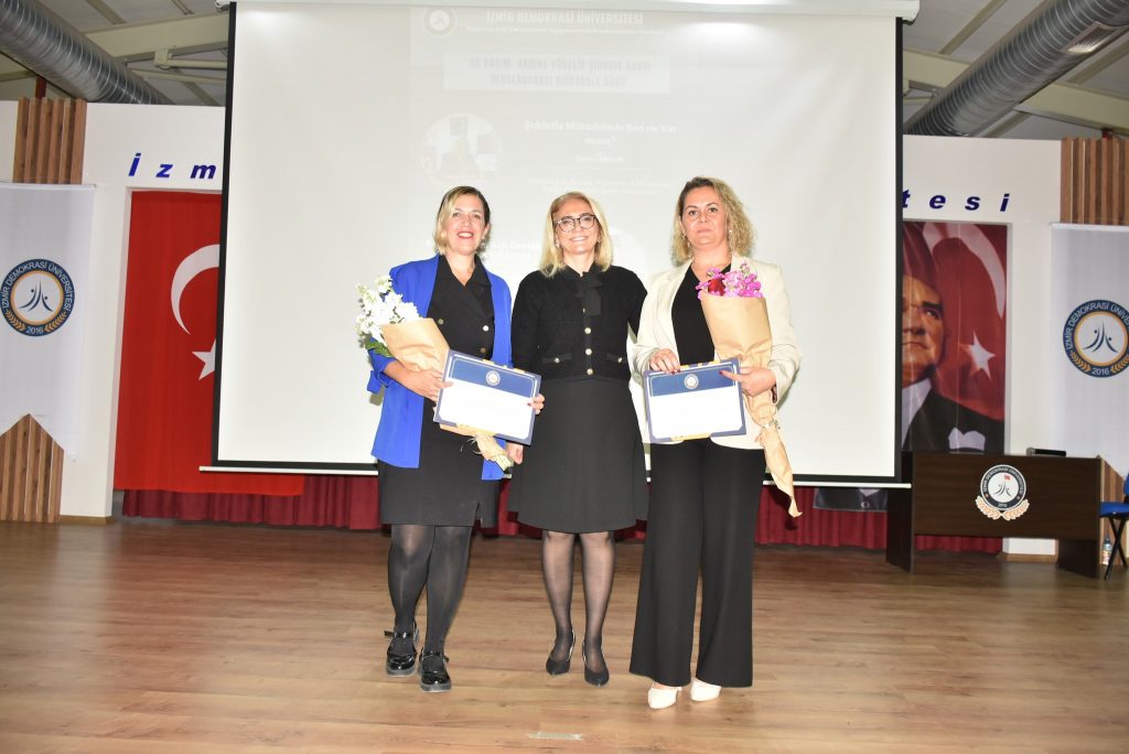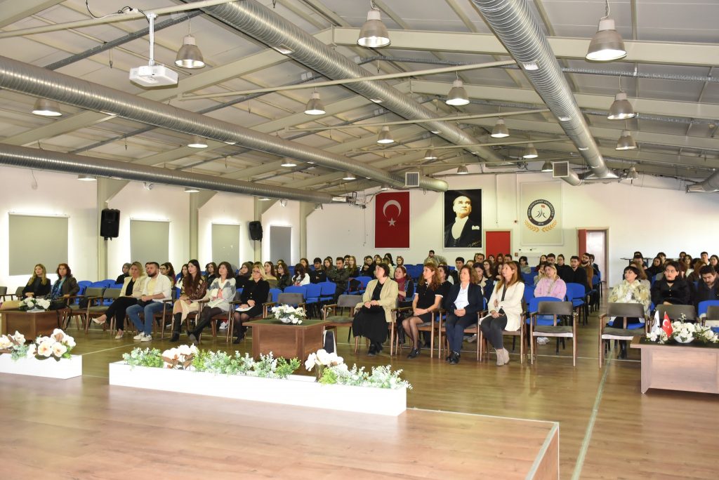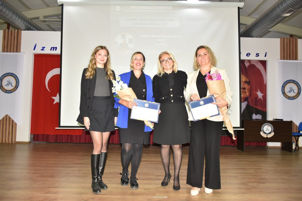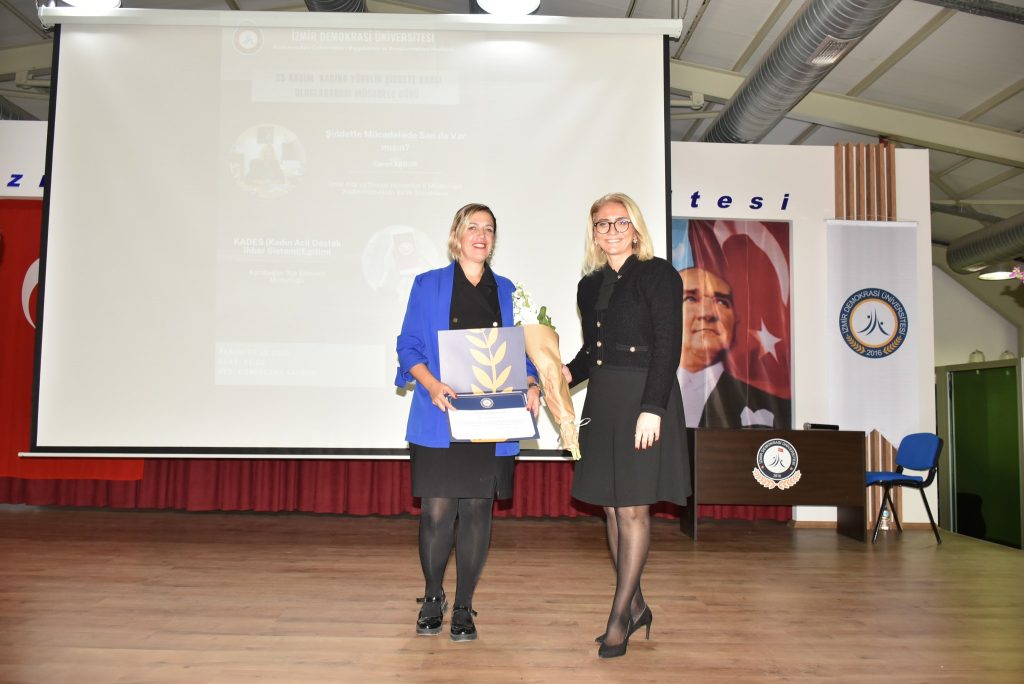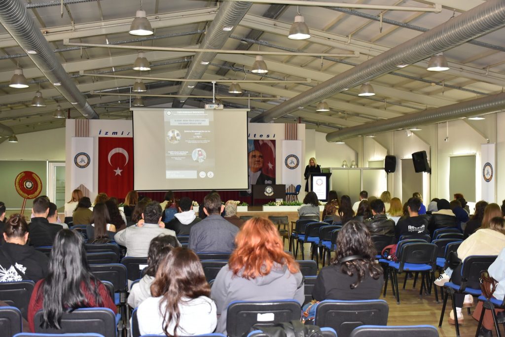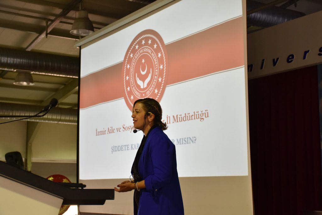 Program, Kadın ve Aile Çalışmaları Uygulama ve Araştırma Merkez Müdürü Prof. Dr. Hande Şahin’in açılış konuşmalarıyla başladı. Ardından İzmir Aile ve Sosyal Hizmetler İl Müdürlüğü Kadın Hizmetleri Birimi Sorumlusu Ceren Erdur “Şiddetle Mücadelede Sen de Var mısın?” başlıklı konuşmasında, kadına yönelik şiddetin tanımı, türleri ve doğru bilinen yanlışlarla ilgili kapsamlı bir eğitim sundu.