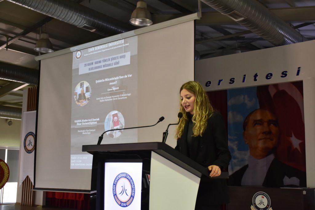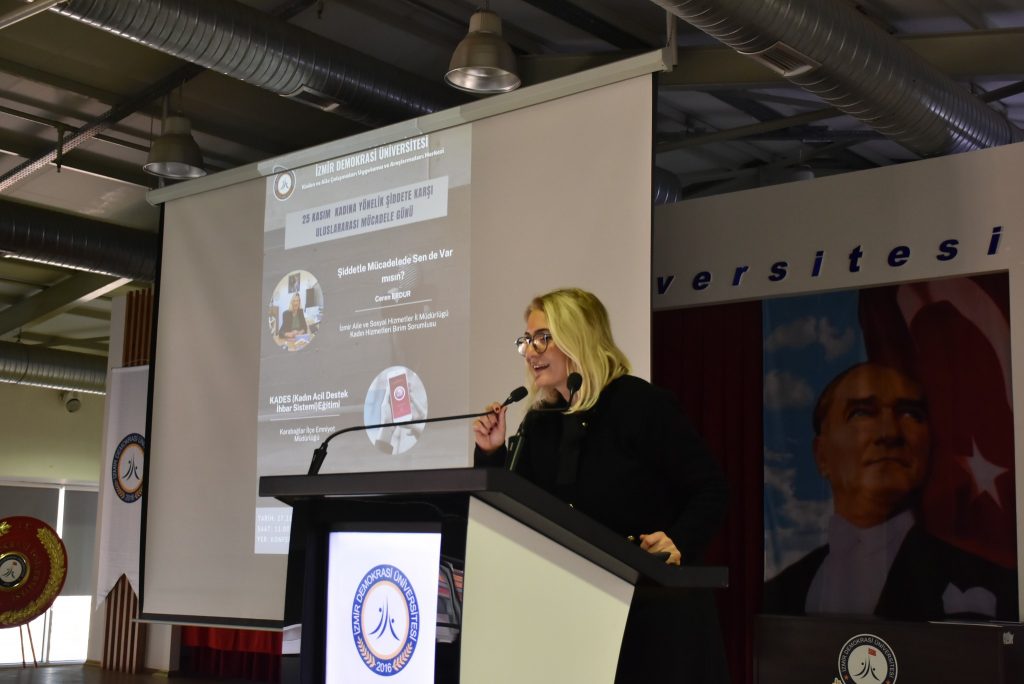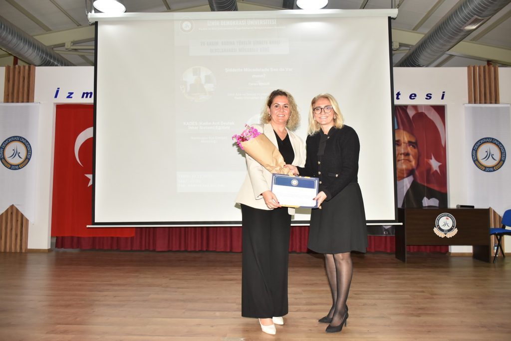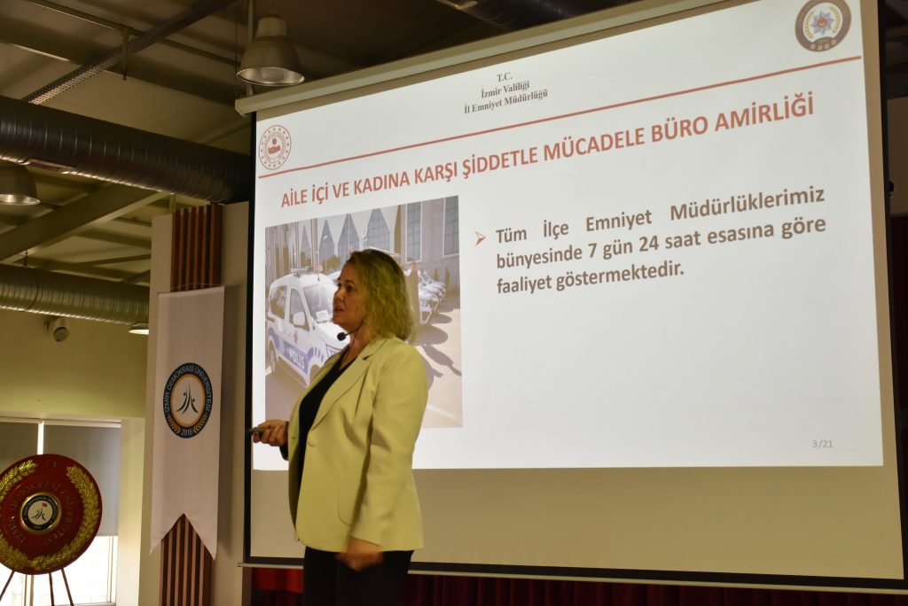 Etkinliğin ikinci bölümünde, İzmir İl Emniyet Müdürlüğü Asayiş Şube Müdürlüğü Aile içi ve Kadına Karşı Şiddetle Mücadele Büro Amirliği’nden Polis Memuru Özgür Polat ise şiddet anında kolluğa ulaşma yolları, sağlanan koruma hizmetleri ve KADES uygulamasının kullanımı konusunda bilgilendirme yaptı.