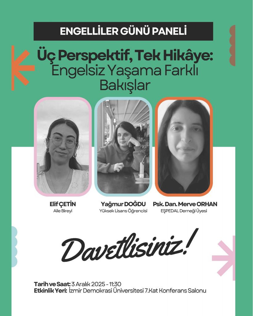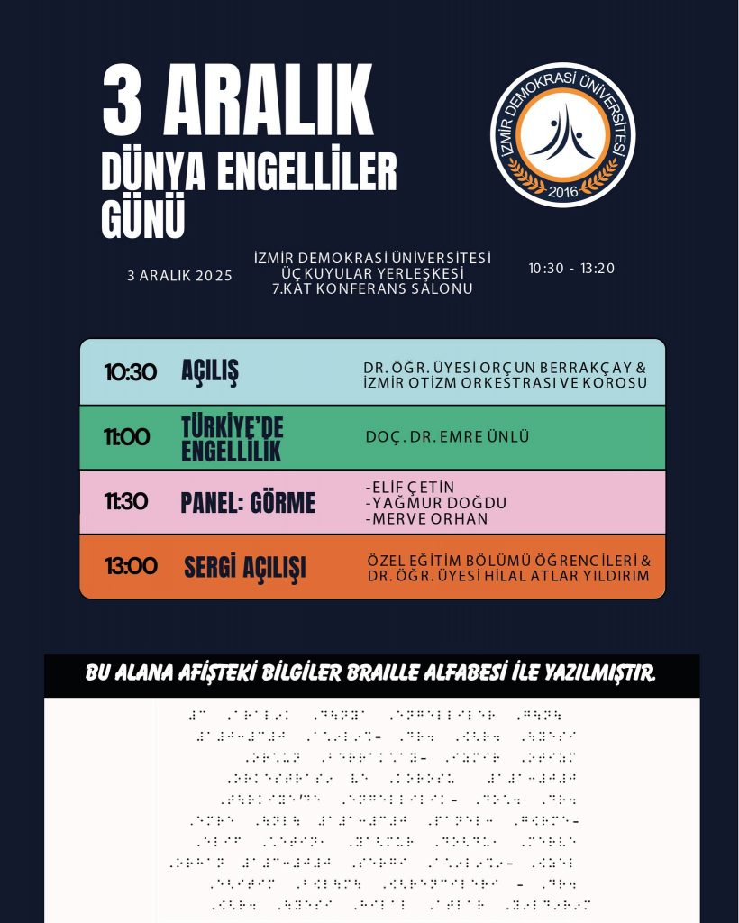 İzmir Demokrasi Üniversitesi Özel Eğitim Uygulama ve Araştırma Merkezi tarafından 3 Aralık Dünya Engelliler Günü kapsamında konser, konferans, panel ve sergiden oluşan bir program düzenleniyor.
