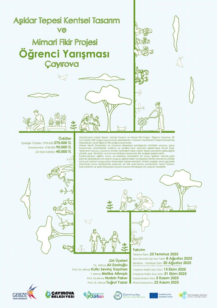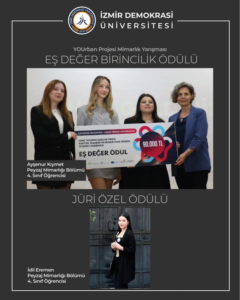 Çayırova Belediyesi ve Gebze Teknik Üniversitesi iş birliğiyle, Avrupa Komisyonu’na bağlı Avrupa İnovasyon ve Teknoloji (EIT) Birimi tarafından desteklenen YOUrban–KentSenin Projesi kapsamında düzenlenen yarışmada; İzmir Demokrasi Üniversitesi Peyzaj Mimarlığı Bölümü 4. sınıf öğrencisi Ayşenur Kıymet, Dokuz Eylül Üniversitesi Mimarlık Fakültesi öğrencileri Tuğba Şengül ve Esra Kurt ile oluşturduğu ekip ile eşdeğer birincilik ödülüne layık görüldü.