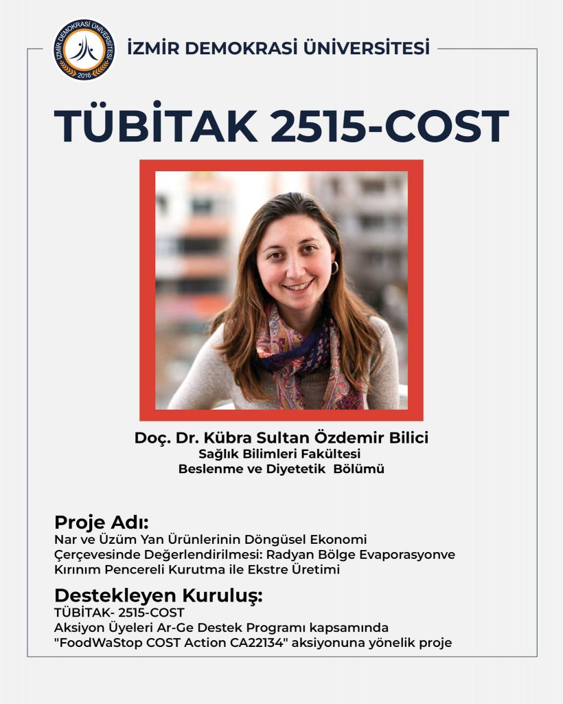 İzmir Demokrasi Üniversitesi Sağlık Bilimleri Fakültesi Beslenme ve Diyetetik Bölümü Öğretim Üyesi Doç. Dr. Kübra Sultan Özdemir Bilici’nin araştırmacı olarak yer aldığı TÜBİTAK- 2515-COST Aksiyon Üyeleri Ar-Ge Destek Programı kapsamında “FoodWaStop COST Action CA22134-Sustainable Network for agrofood loss and waste prevention, management, quantification and valorisation (FoodWaStop)” aksiyonuna yönelik olarak sunulmuş olan “Nar Ve Üzüm Yan Ürünlerinin Döngüsel Ekonomi Çerçevesinde Değerlendirilmesi: Radyan Bölge Evaporasyon Ve Kırınım Pencereli Kurutma ile Ekstre Üretimi” başlıklı proje desteklenmeye hak kazandı. Proje bütçesi yaklaşık 2 milyon TL olan projede çalışmalara başlandı.