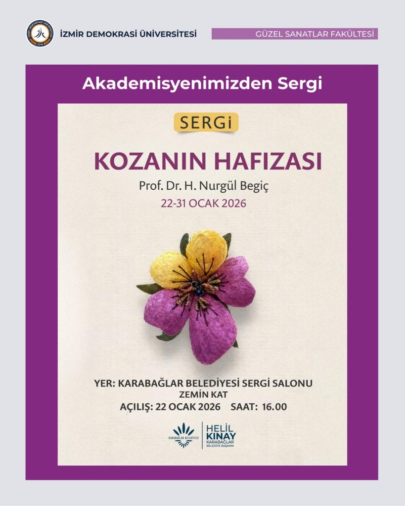 İzmir Demokrasi Üniversitesi Güzel Sanatlar Fakültesi Dekan V. ve Geleneksel Türk Sanatları Öğretim Üyesi Prof. Dr. H. Nurgül Begiç’in “Kozanın Hafızası” adlı sergisi, 22–31 Ocak 2026 tarihleri arasında Karabağlar Belediyesi Sergi Salonu’nda sanatseverlerin ziyaretine açık olacak.