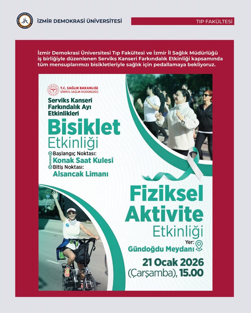 İzmir Demokrasi Üniversitesi Tıp Fakültesi Buca Seyfi Demirsoy Eğitim Araştırma Hastanesi ve T.C. Sağlık Bakanlığı İzmir İl Sağlık Müdürlüğü iş birliğiyle, serviks kanserine dikkat çekmek ve toplumsal farkındalığı artırmak amacıyla bisiklet ve fiziksel aktivite etkinliği düzenleniyor.