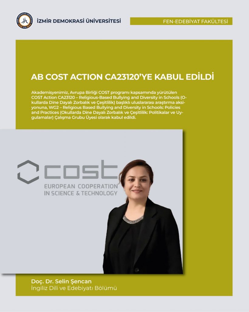 Akademisyenimiz, Avrupa Birliği COST programı kapsamında yürütülen COST Action CA23120 – Religious‐Based Bullying and Diversity in Schools (Okullarda Dine Dayalı Zorbalık ve Çeşitlilik) başlıklı uluslararası araştırma aksiyonuna, WG2 – Religious Based Bullying and Diversity in Schools: Policies and Practices (Okullarda Dine Dayalı Zorbalık ve Çeşitlilik: Politikalar ve Uygulamalar) Çalışma Grubu Üyesi olarak kabul edildi.
