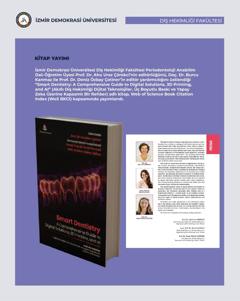 İzmir Demokrasi Üniversitesi Diş Hekimliği Fakültesi Periodontoloji Anabilim Dalı Öğretim Üyesi Prof. Dr. Ahu Uraz Çörekçi’nin editörlüğünü, Doç. Dr. Burcu Kanmaz ile Prof. Dr. Deniz Özbay Çetiner’in editör yardımcılığını üstlendiği “Smart Dentistry: A Comprehensive Guide to Digital Solutions, 3D Printing, and AI” (Akıllı Diş Hekimliği: Dijital Teknolojiler, Üç Boyutlu Baskı ve Yapay Zeka Üzerine Kapsamlı Bir Rehber) adlı kitap, Web of Science Book Citation Index (WoS BKCI) kapsamında yayımlandı.