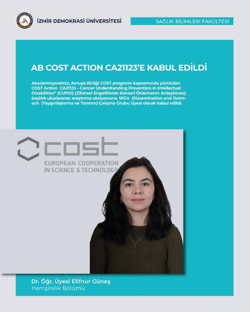 Sağlık Bilimleri Fakültesi Hemşirelik Bölümünden Dr. Öğr. Üyesi Elifnur Güneş, Avrupa Birliği COST programı kapsamında yürütülen COST Action CA21123 “Cancer Understanding Prevention in Intellectual Disabilities” (CUPID) (Zihinsel Engellilerde Kanseri Önlemenin Anlaşılması) başlıklı uluslararası araştırma aksiyonuna, WG4 –Dissemination and Outreach (Yaygınlaştırma ve Tanıtım) Çalışma Grubu Üyesi olarak kabul edildi.