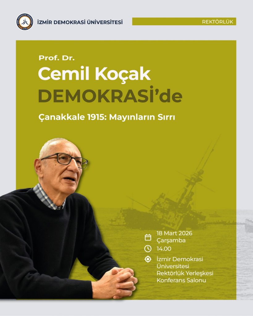 Prof. Dr. Cemil Koçak, “Çanakkale 1915: Mayınların Sırrı” başlıklı konferansıyla 18 Mart Çarşamba günü saat 14.00’te İzmir Demokrasi Üniversitesi Rektörlük Yerleşkesi Konferans Salonu’nda dinleyicilerle buluşacak. Tüm ilgililer davetlidir.