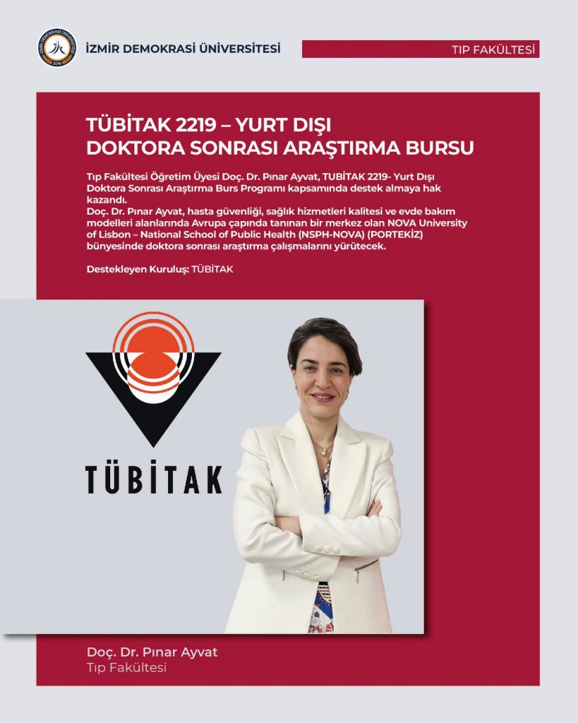 Bu kapsamda Doç. Dr. Pınar AYVAT, hasta güvenliği, sağlık hizmetleri kalitesi ve evde bakım modelleri alanlarında Avrupa çapında tanınan bir merkez olan NOVA University of Lisbon – National School of Public Health (NSPH-NOVA) (PORTEKİZ) bünyesinde doktora sonrası araştırma çalışmalarını yürütecek.