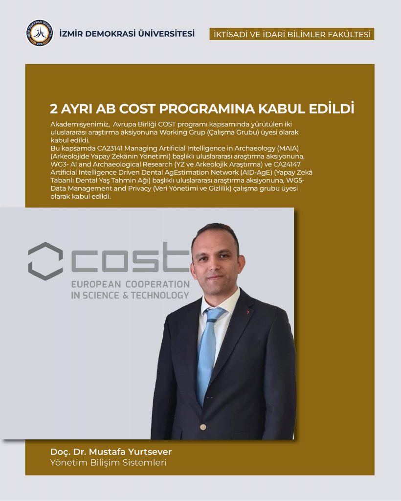 İktisadi İdari Bilimler Fakültesi Yönetim Bilişim Sistemleri Öğretim Üyesi Doç. Dr. Mustafa Yurtsever, Avrupa Birliği COST programı kapsamında yürütülen iki uluslararası araştırma aksiyonuna Working Grup (Çalışma Grubu) üyesi olarak kabul edildi.