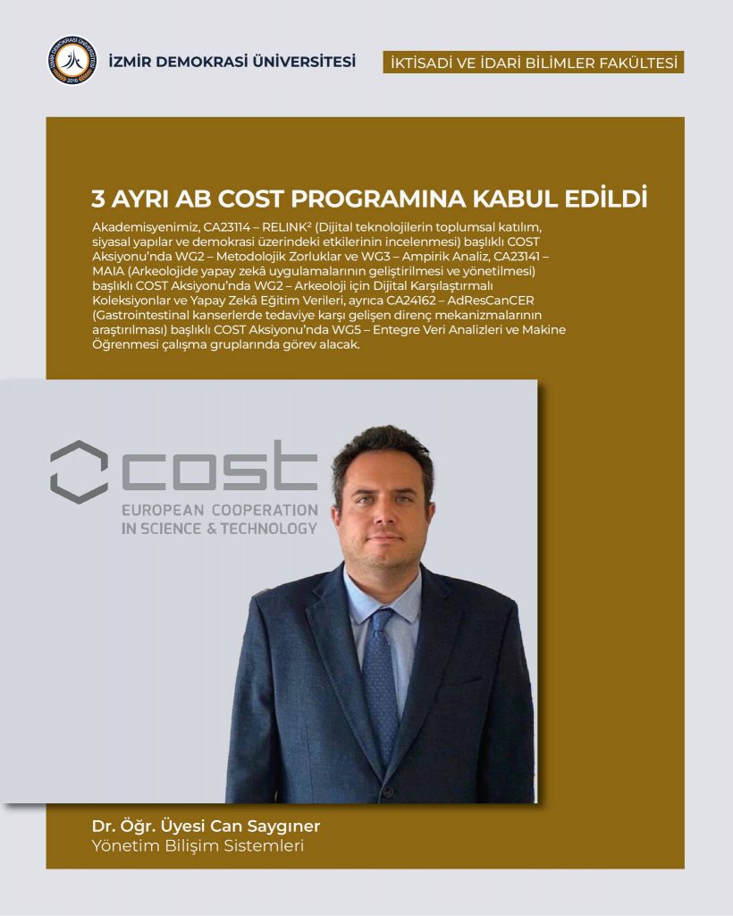İktisadi ve İdari Bilimler Fakültesi Yönetim Bilişim Sistemleri Bölümü Öğretim Üyesi Dr. Öğr. Üyesi Can Saygıner, COST (European Cooperation in Science and Technology) programı kapsamında yürütülen üç uluslararası araştırma aksiyonuna Çalışma Grubu üyesi olarak kabul edildi.